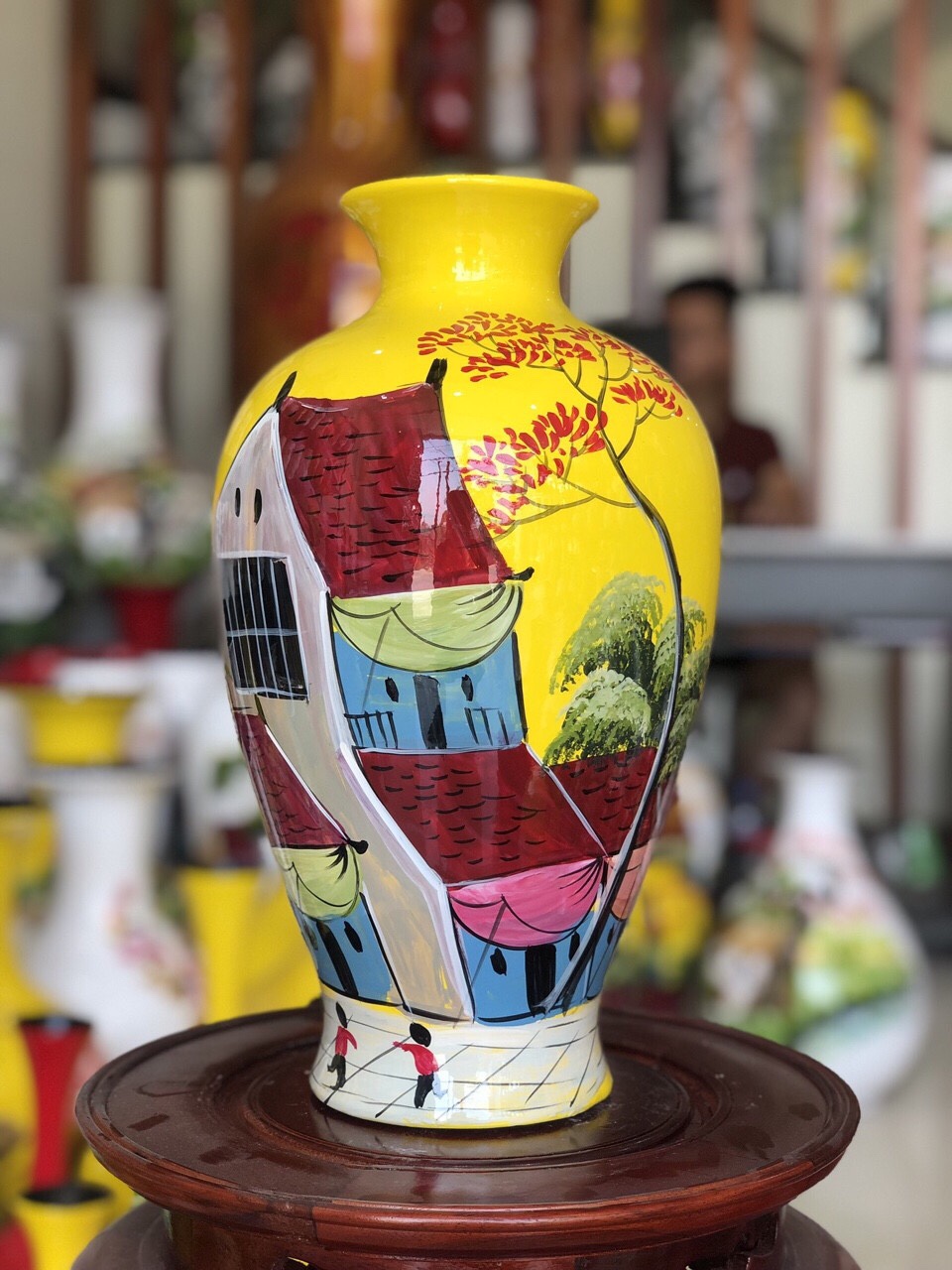 Lọ hoa sơn mài dáng đùi dế vẽ phố cổ S2